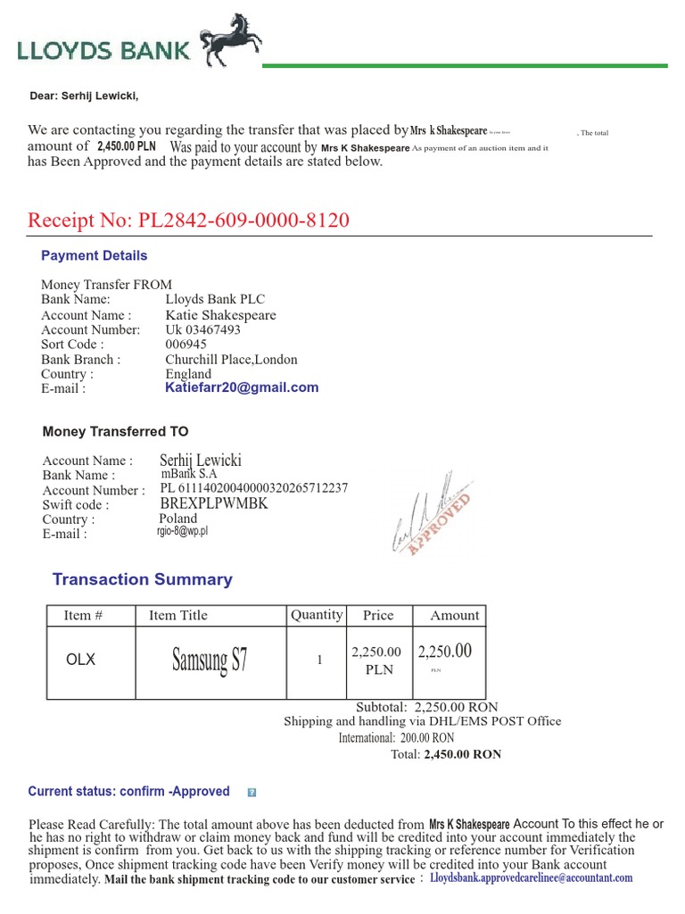 Payment Lloyds Bank Transfer Receipt
